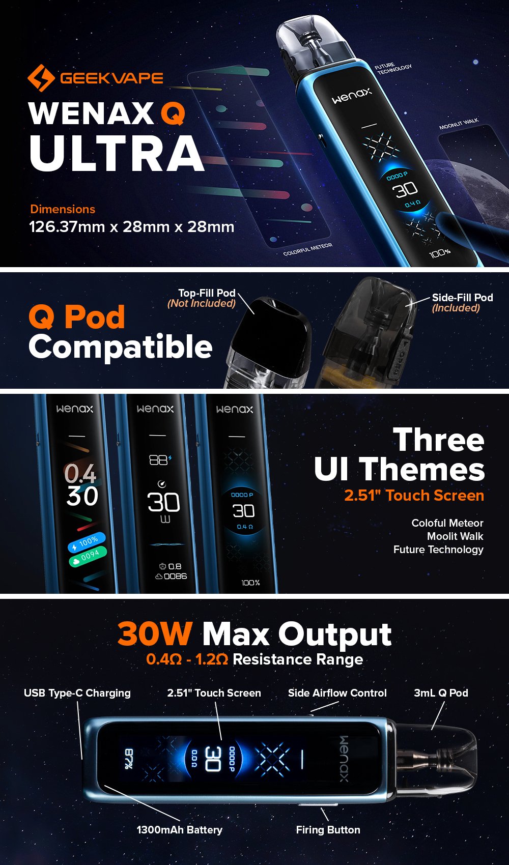 تسوق طقم Geek Vape WENAX Q Ultra 30W، الذي يتميز ببطارية 1300 مللي أمبير/ساعة، ومتوافق مع Geek Vape Q Pod، ويضم 3 واجهات استخدام ديناميكية مع شاشة لمس. هيكل WENAX Q Ultra مصنوع من مواد معدنية متينة، وهو نحيف وأنيق. مزود بشاشة OLED كبيرة مقاس 2.51 بوصة، يعمل WENAX Q Ultra بشاشة لمس ذكية، مما يتيح تحكمًا دقيقًا وسريع الاستجابة. مميزات جهاز GEEK VAPE WENAX Q ULTRA 30W POD KIT: