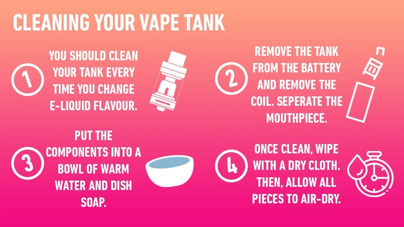 لا يقتصر تنظيف السيجارة الإلكترونية على غسلها فقط. يمكن غسل بعض أجزاء السيجارة الإلكترونية، على سبيل المثال، الخزان أو خرطوشة البود، بالماء الدافئ. ثم يجب تركها لتجف تمامًا قبل إعادة تجميعها أو استخدامها مرة أخرى. قد تتعرض بعض الأجزاء مثل بطاريات السيجارة الإلكترونية أو صندوق التعديل غير المقاوم للماء للتلف بسبب الماء وتتعطل تمامًا.